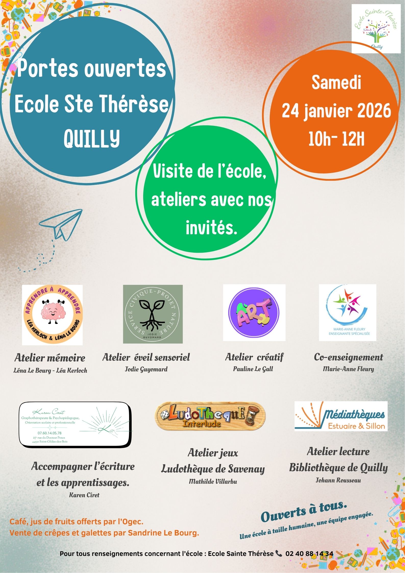 Portes ouvertes École Sainte-Thérèse de Quilly Vous cherchez une école à taille humaine, attentive au bien-être et aux apprentissages de chaque enfant ? 👉 Nous vous ouvrons nos portes le samedi 24 janvier 2026, de 10h à 12h. Au programme : Ateliers autour de la lecture, de l’écriture et de la mémorisation Ateliers sensoriels,