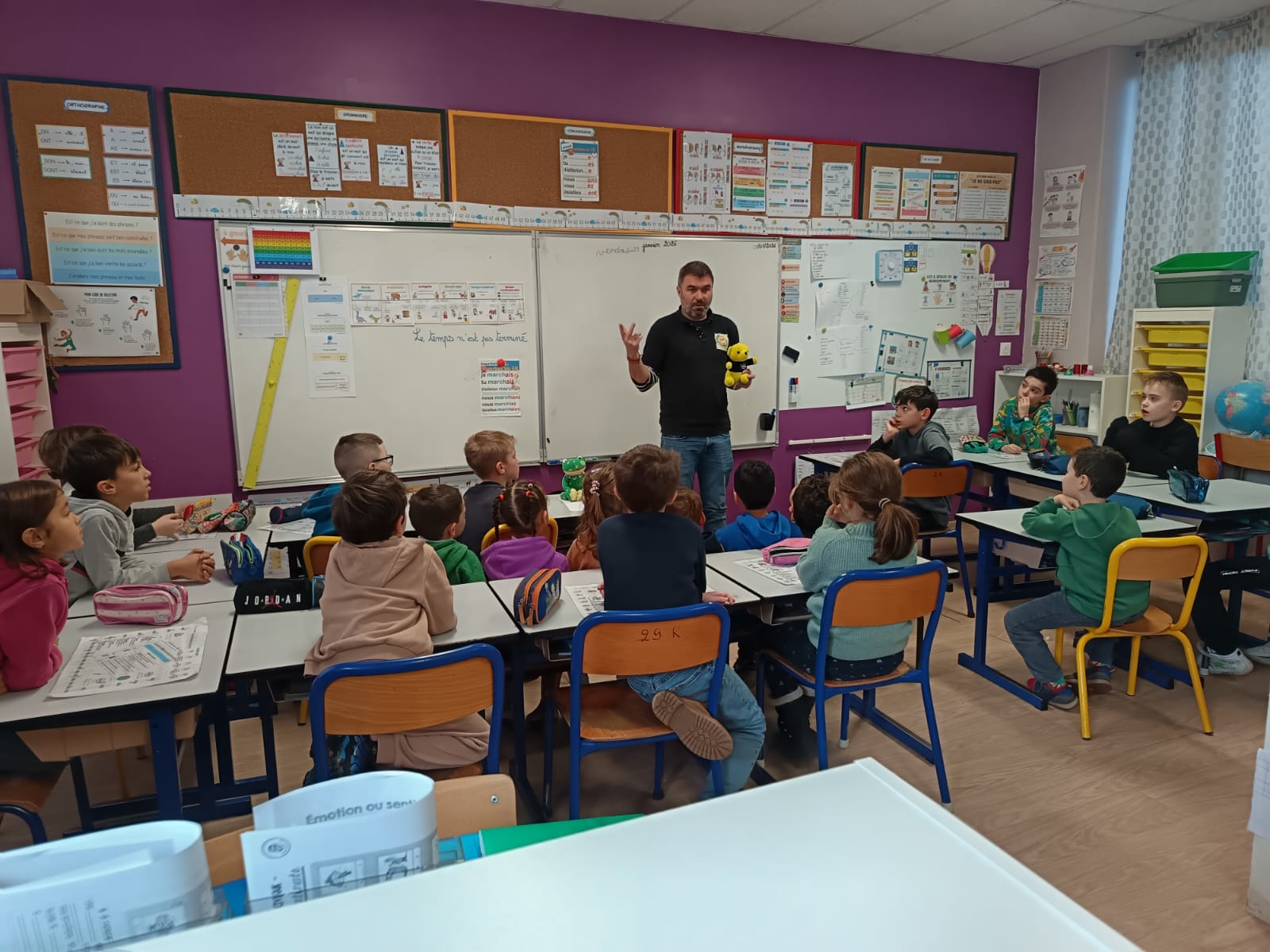 Aujourd’hui, chaque classe a reçu Anthony , fondateur de l’association educarT. Son projet est de faire voyager des dessins d’enfants à travers le monde et de collecter des crayons usagés afin de financer des fournitures scolaires pour des enfants vivant dans des pays défavorisés. Chaque enfant va réaliser un dessin au format A4 représentant sa