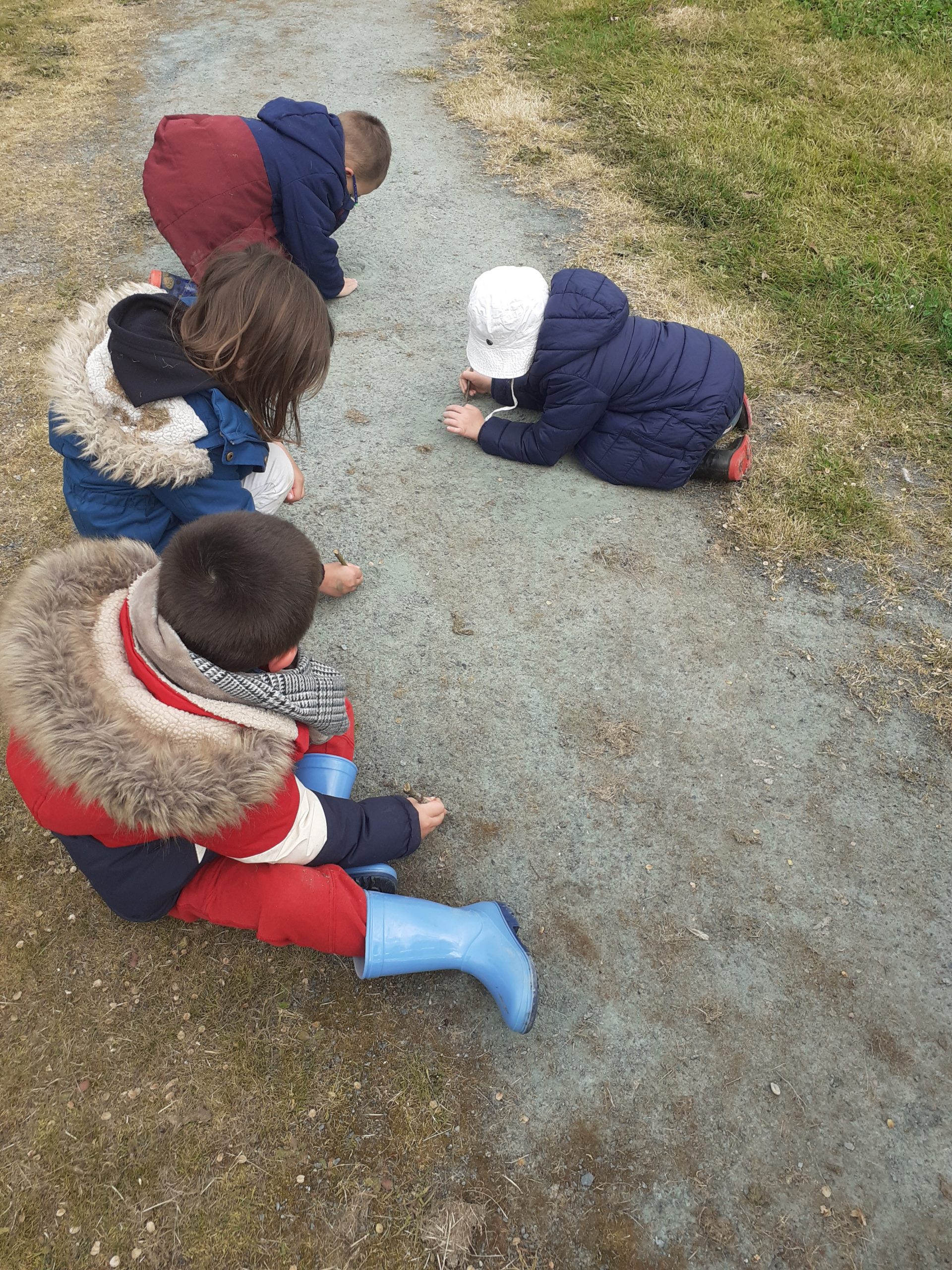 Depuis le début de la période, tous les 15 jours le jeudi, nous partons faire l’école du dehors toute la matinée au parc de Quilly. Nous y faisons des mathématiques avec les éléments de la nature, du graphisme avec des morceaux de bois sur le chemin ou encore un cache cache pour retrouver nos prénoms.