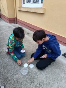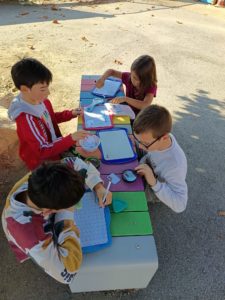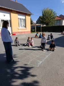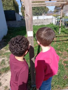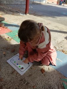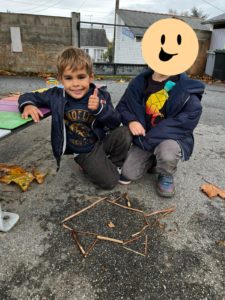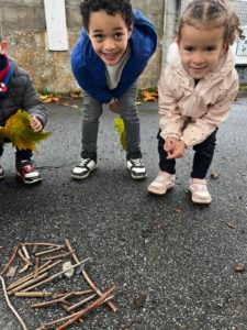Les activités sont variées : motricité, mathématiques, dictée, étude de la langue, découverte du monde… Parfois, les élèves travaillent en ateliers, et d’autres fois, ils utilisent ce que leur offre la nature pour apprendre autrement. Compter avec des marrons, recomposer son prénom ou comparer des tailles avec des bâtons, trier des feuilles, observer les insectes ou créer notre support de travail à la craie deviennent autant d’occasions d’apprendre en manipulant et en observant le réel.